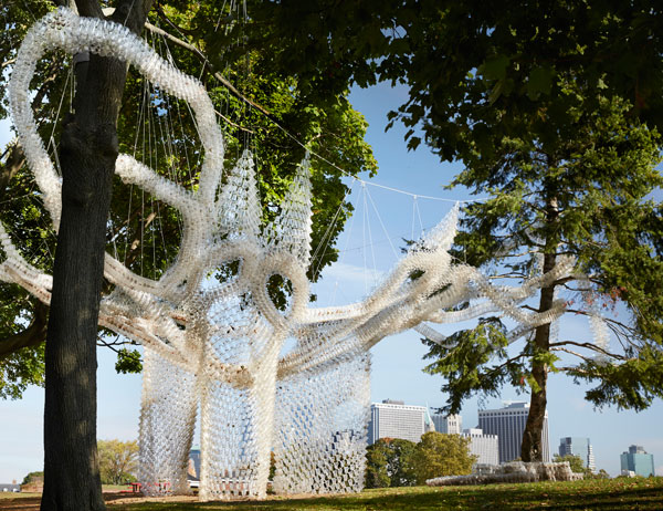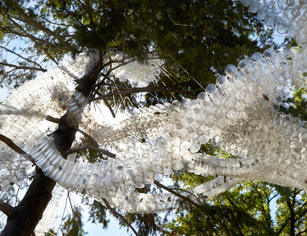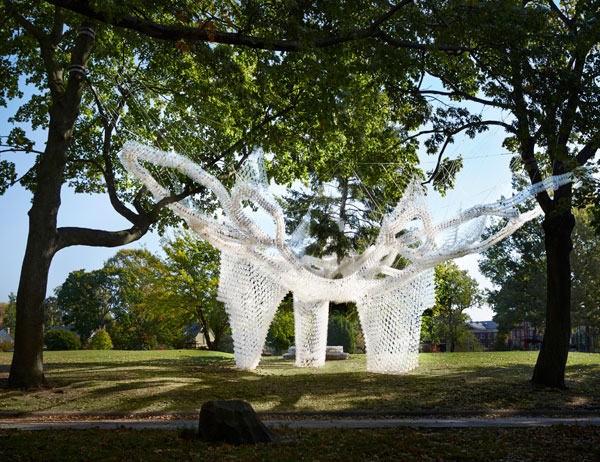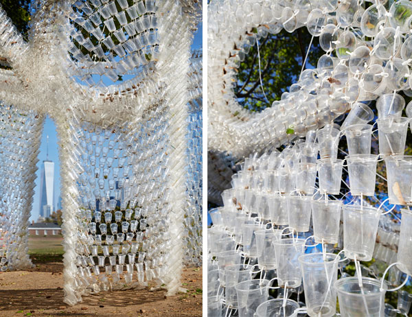 The result of this far-reaching teamwork was an innovative pavilion located in one of New York’s most unique public spaces. The tape-beam loops wrapped in, through and around trees to form a serpentine canopy that was in-filled with lacy constellations of cups. The passage of the sun over the day reflected in the lantern-like luminosity of different densities of the plastic pavilion. Wind audibly filtered through the cups. Governor’s Cup Pavilion formed a place for gathering, interaction and performance. It was a playground for children and adults.