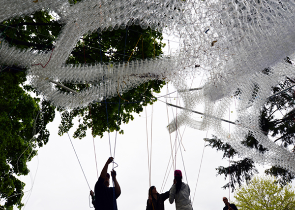 Inspired by the structural strategies of tape-lace crochet techniques, CDR’s Governor’s Cup was a nod to the 100 billion cups that accumulate in landfills each year. In fabricating the Governor’s Cup, CDR Studio was able to bring together a robust design team, a troop of 100+ volunteers, and numerous other supporters to help bring their vision to reality. The team successfully diverted 30,000 plastic cups from New York City’s garbage stream, collected from venues throughout the city, then cleaned and reused. CDR Studio also managed to crowd-source more than $14,000 to help pay for the pavilion’s construction – a record for this five-year annual competition – and its volunteers were an integral part of every phase of the pavilion’s realization. Volunteers met in the CDR Studio twice a week, helping to drill holes in the recycled cups, glue them together, and create the modules that would eventually form the serpentine pieces of the pavilion. CDR received structural assistance from the Robert Silman Associates.