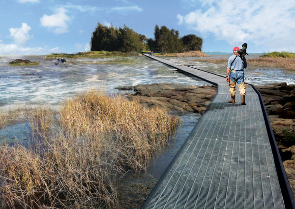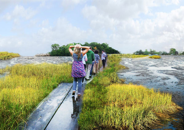 An extensive network of paths, some robust and permanent, and others delicate and floodable, will connect The Armory Portal to Five Island Parks. Surface trails link to the waterfront and lead visitors through island trails and along sandy beaches.