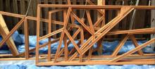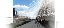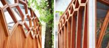 The Dragonfly Pavilion is situated in a long rectangular garden behind a four-story townhouse in Hoboken, New Jersey.  Pavilion  is Latin for Papillion  or “butterfly.”  Drawing from the complex structural pattern of butterfly and dragonfly wings, our team came to understand that the pattern was not merely ornamental, but highly efficient: its intricacies are created by its form.  The skeletal structure of the Pavilion is a gradient of complex geometric shapes.